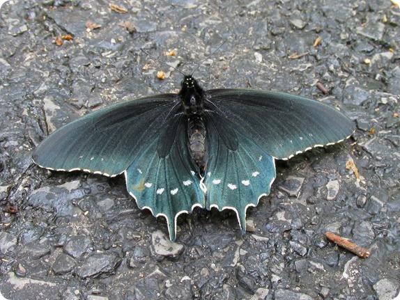 This new-to-us Spicebush Swallowtail (Papilio troilus) made a very brief appearance before flying away.